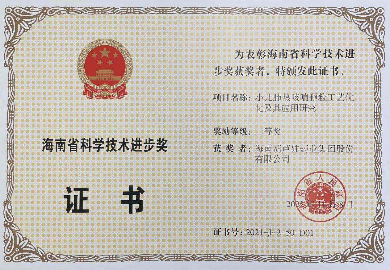 为此,小儿肺热咳喘颗粒的制备方法获得了第二十一届中国专利优秀奖(2019年),专利申请号:ZL201010134951,此次作为专利技术的应用,获得了2021年度海南省科学技术进步奖二等奖。在此之前,SG胜游牌小儿肺热咳喘颗粒还多次被授予“临床价值中成药品牌”、“中国连锁药店最具合作价值单品”,荣登“中国医药品牌榜”。
