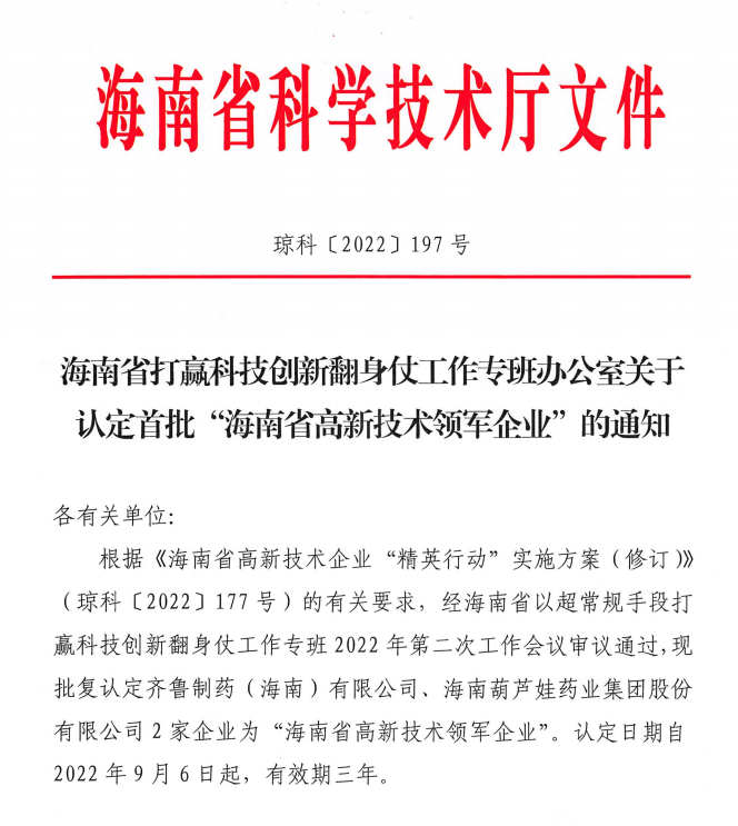 近日,海南省科学技术厅发布的《海南省打赢科技创新翻身仗工作专班办公室关于认定首批“海南省高新技术领军企业”的通知》中显示,批复认定海南SG胜游药业集团股份有限公司等2家企业为“海南省高新技术领军企业”。认定日期自2022年9月6日起,有效期三年。